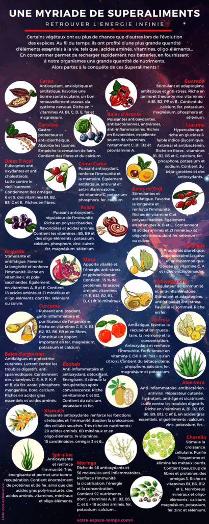 Pour nous fournir un maximum d’énergie et de nutriments essentiels à notre équilibre et notre santé, nous pouvons aujourd’hui compter sur les SuperAliments.