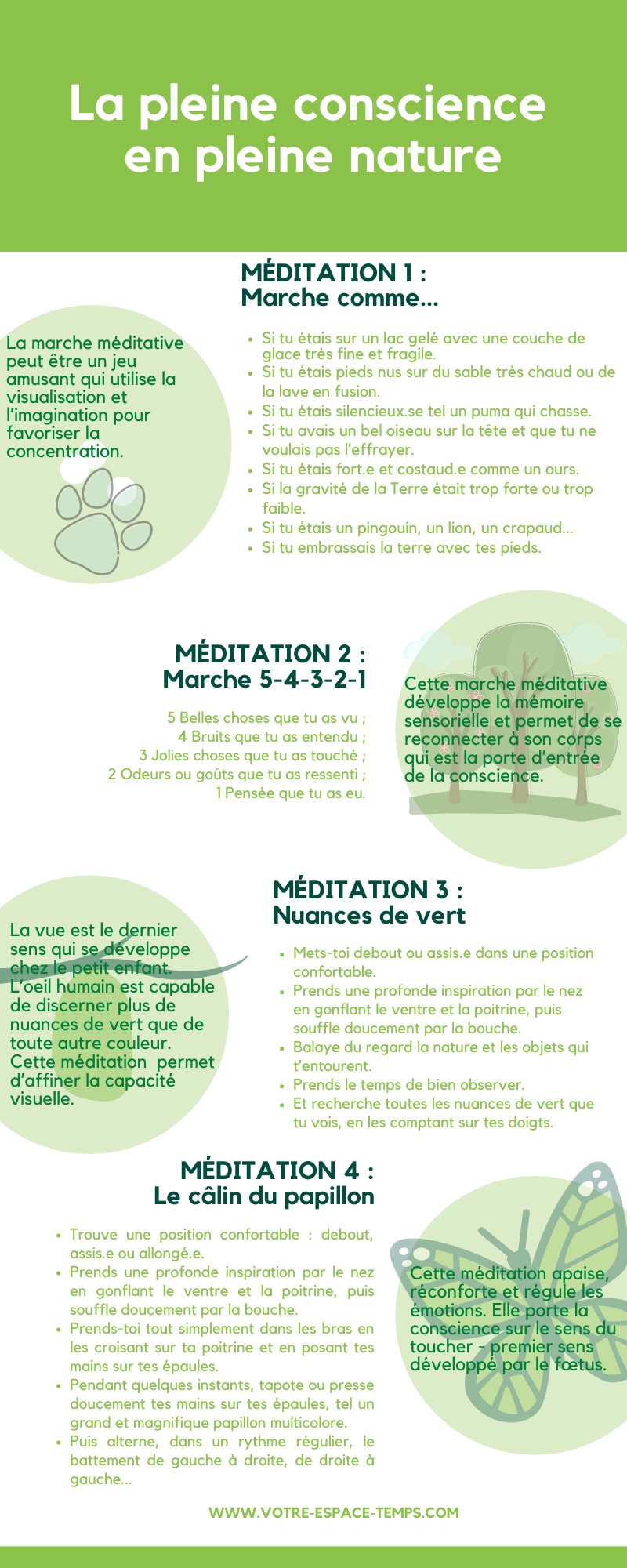 Voici une série de quatre méditations de pleine conscience à faire avec les enfants. Il s’agit de passer un moment en pleine nature, tout en étant présent dans l’ici et maintenant…