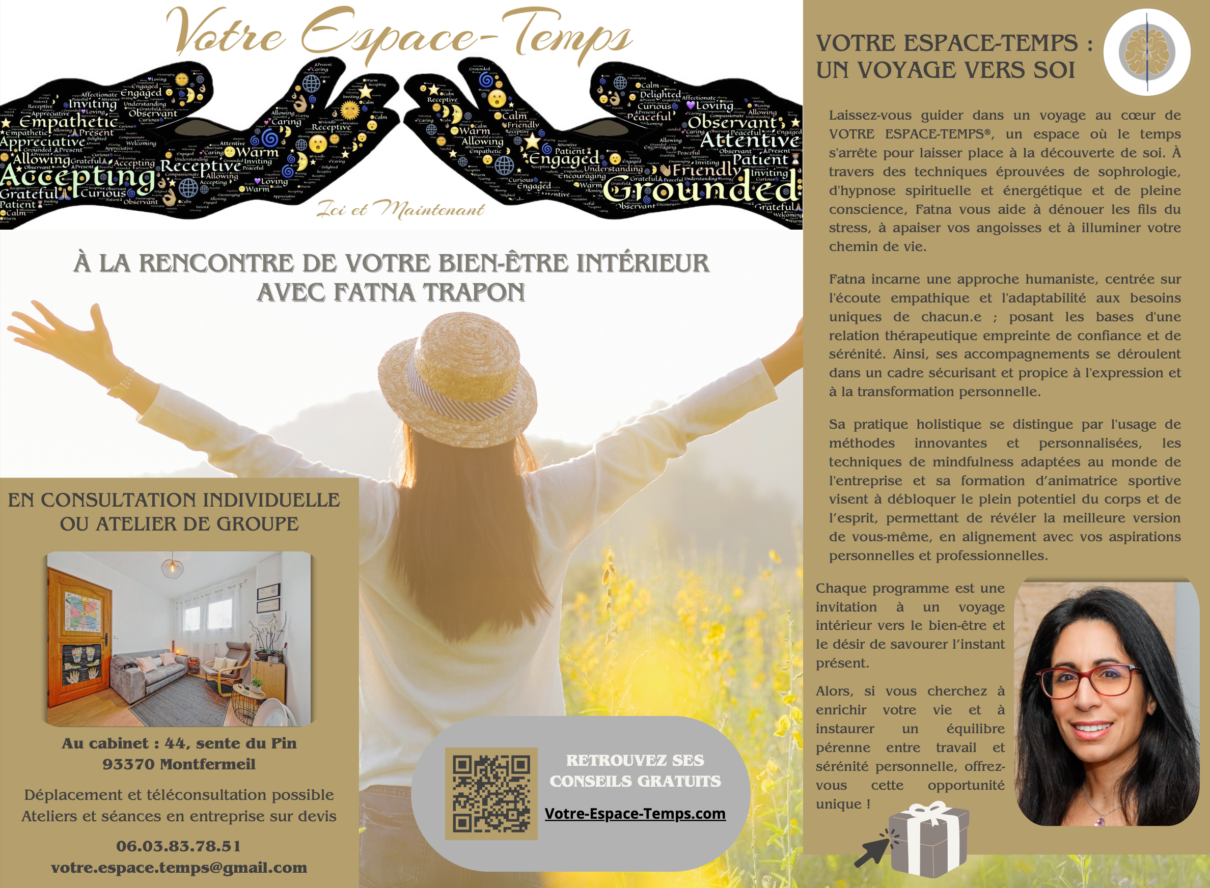 Votre Espace-Temps est un espace dédié à la découverte de soi, fondé par Fatna TRAPON, qui combine sophrologie et hypnose pour un accompagnement unique.